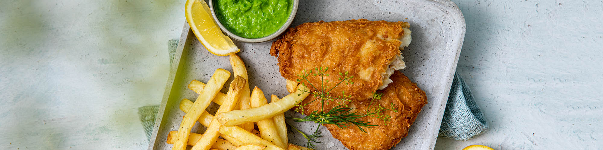 Fish & Crisp bataattilohkojen kera